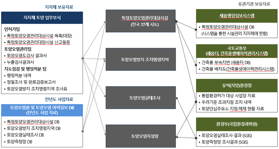 - 「토양환경보전법」 제4조의4(토양오염관리대상시설 등 조사) 및 제4조의5(토양오염 이력정보의 작성‧관리)에 따른 전국 토양오염원 및 토양오염 이력정보 자료 수집