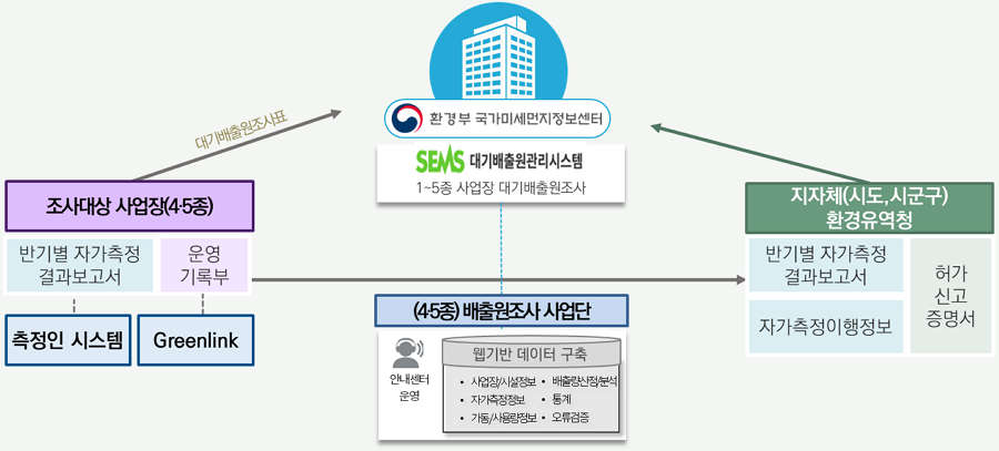 - 약 280여개 기초지자체로부터 신고증과 반기별 자가측정 결과보고서, 기타 자료를 수집하고, 측정대행업체에서도 대기측정기록부를 수집하여 구축합니다.