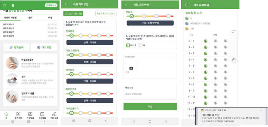 - 아토피수첩3 앱: 증상정도, 투약여부, 환부사진, 메모 등의 환자별 증상정보와 집, 어린이집, 회사 등 외부 활동 시간정보를 입력