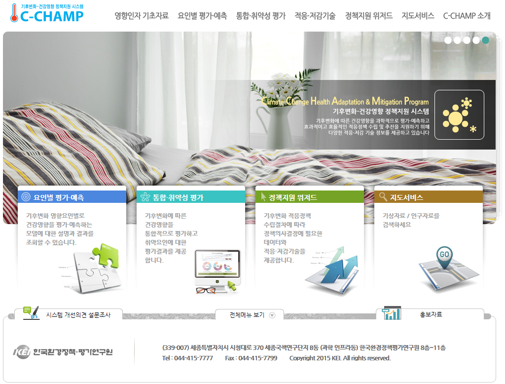 기후변화-건강영향 DB 및 툴박스 모듈 개발 (4차년도) 작성일자 2014년 04월 01일2025년 03월 28일 글쓴이 GreenEcos 사 업 명: 기후변화-건강영향 DB 및 툴박스 모듈개발사업개요: R&D과제, 기후변화, 웹기반사업기간: 2014. 4. 1 ~ 2015. 3. 31발주기관: 한국환경산업기술원c-champ main