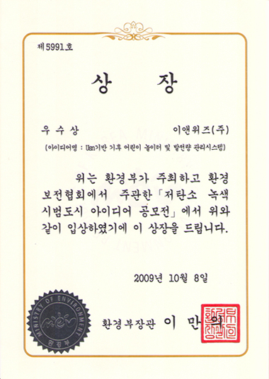 저탄소 녹색 시범도시 아이디어 공모전에서 우수상수상 작성일자 2009년 10월 08일2020년 07월 29일 글쓴이 GreenEcos환경부 주최하고 환경보전협회에서 주관한 저턴소 녹색 시범도시 아이디어 공모전에서 이앤위즈(주)가 우수상을 수상했습니다.공모전 우수상장