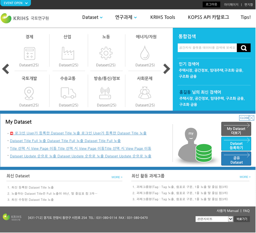 국토계획 수립하기 위한 공간자료와 빅데이터, 통계자료 등을 여러 가지 분석도구로 분석하여 국토의 현안과제를 진단하고 합리적이고 효과적인 대안을 제시하기 위한 공간지식플랫폼 시범시스템의 개선작업을 마쳤습니다. 국책연구기관을 대상으로 하는 시스템입니다.