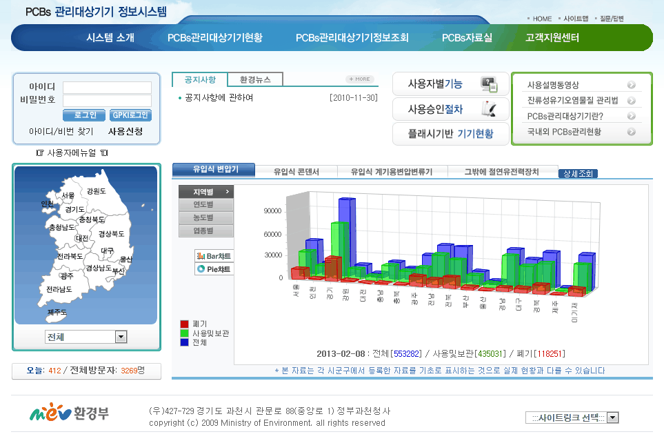 - 사업개요: 스톡홀름협약의 국내 비준(‘07.1.25)과 「잔류성유기오염물질 관리법」이 시행(‘08.1.27)됨에 따라, 협약 및 법령에서 정하고 있는 PCBs 함유기기 관리의 원활한 수행을 위한 전국의 유입식 변압기(pcbs 2ppm 이상 함유기기) 등의 정보를 수집하여 DB로 구축하고 기기정보 및 현황을 파악하는 시스템