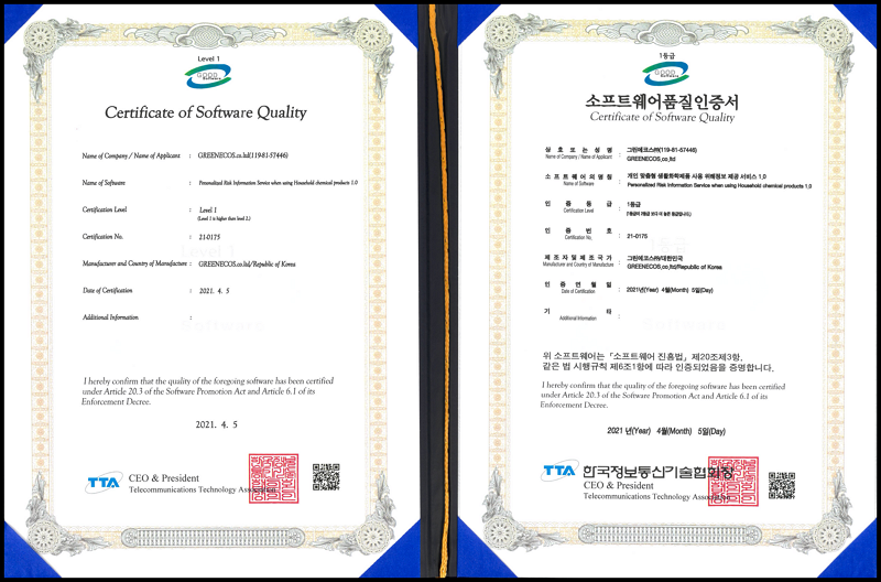 당사에서 개발한 “개인 맞춤형 생활화학제품 위해정보 제공 서비스”에 대한 GS인증(1등급)을 획득했습니다.