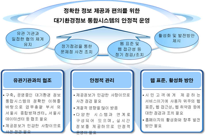 서울시민의 건강을 위한 종합적인 대기질 분석과 대기오염정보의 실시간 제공의 위해 구축된 “대기환경정보 통합시스템“의 안정적인 운영을 위하여 각 기관별 연계 데이터 관리, 측정 자료 및 모델링 자료의 분석 정확도 관리, 정책결정 및 대민 서비스 시스템 유지보수