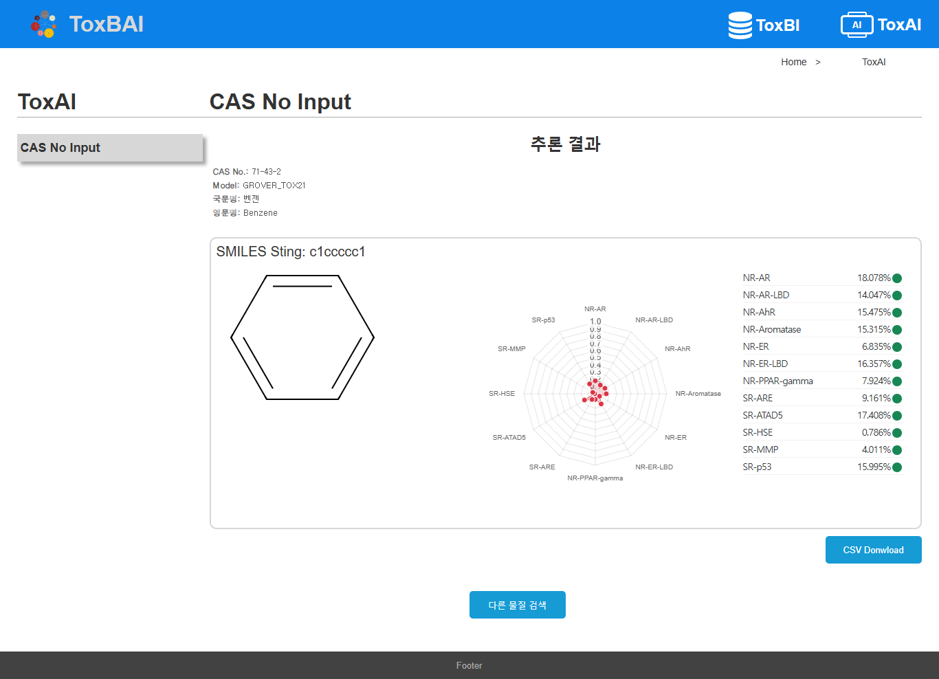 ‘데이터 분석 및 분석 플랫폼 개발사업’을 통해, 기존에 구축된 ToxAI 플랫폼의 화학물질정보 데이터베이스 설계와 구축, AI 모델을 연계하여 직관적인 사용자 인터페이스를 구현 했습니다.