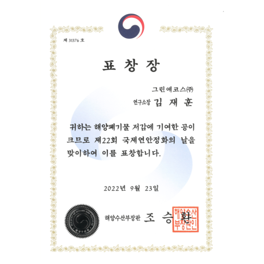 연구소장, 해양수산부장관 표창장 수상 작성일자 2022년 09월 27일2025년 01월 22일 글쓴이 GreenEcos 당사 김재훈 연구소장이 해양수산부장관 표창을 받았습니다. 제22회 국제연안정화의 날을 맞아, 여러 사업을 수행하며 해양폐기물 저감에 기여한 공을 인정받아서 수상하게 됐습니다.