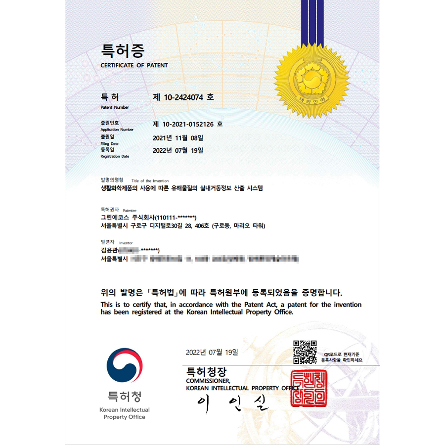 [특허] 생활화학제품의 사용에 따른 유해물질의 실내거동정보 산출 시스템 작성일자 2022년 07월 22일2025년 03월 28일 글쓴이 GreenEcos 당사에서 개발한 ‘생활화학제품의 사용에 따른 유해물질의 실내거동정보 산출 시스템’의 특허를 등록했습니다.