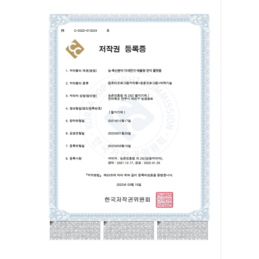 [저작권] 농축산분야 미세먼지 배출량 관리 플랫폼 작성일자 2022년 03월 18일2025년 03월 28일 글쓴이 GreenEcos 농촌진흥청과 함께 개발한 ‘농축산분야 미세먼지 배출량 관리 플랫폼’의 저작권 등록을 마쳤습니다.
