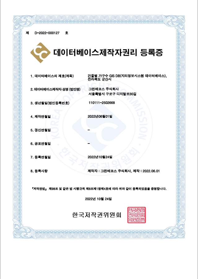당사에서 수행하고 있는 ‘환경위험시설 취약지역 및 환경보건상태 평가 정보플랫폼’ 사업을 위해 구축한 GIS DB 10건의 저작권 등록을 마쳤습니다.