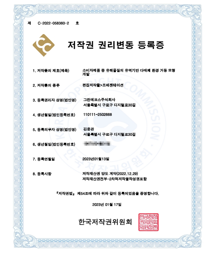 [저작권] 소비자제품 중 유해물질의 유역기반 다매체 환경 거동 모형 작성일자 2023년 01월 19일2025년 03월 28일 글쓴이 GreenEcos 당사에서 연구개발한 ‘소비자제품 중 유해물질의 유역기반 다매체 환경 거동 모형’에 대한 저작권 등록을 마쳤습니다.