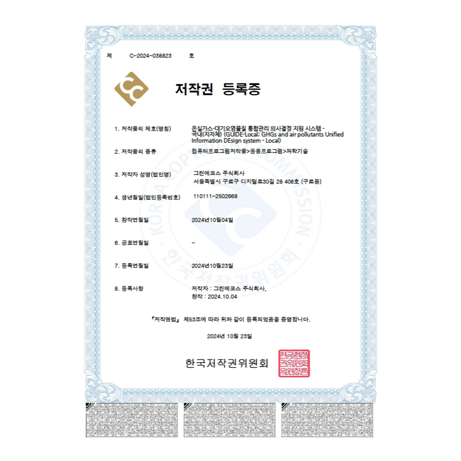 [저작권] 온실가스-대기오염물질 통합관리 의사결정 지원 시스템 작성일자 2024년 10월 28일2025년 03월 28일 글쓴이 GreenEcos 당사에서 개발한 ‘온실가스-대기오염물질 통합관리 의사결정 지원 시스템(GHGs and air pollutants Unified Information DEsign system)’의 저작권 등록을 마쳤습니다.