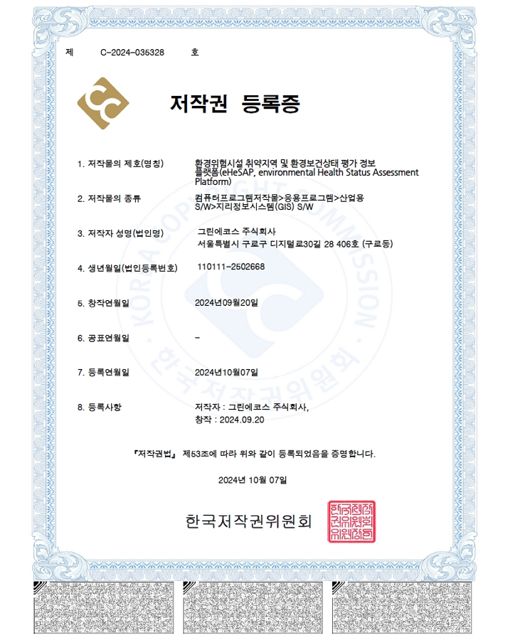 [저작권] 환경위험시설 취약지역 및 환경보건상태 평가 정보플랫폼 작성일자 2024년 10월 09일2025년 03월 28일 글쓴이 GreenEcos 환경위험시설 취약지역 및 환경보건상태 평가 정보 플랫폼 (eHeSAP, environmental Health Status Assessment Platform) 의 저작권을 등록했습니다.